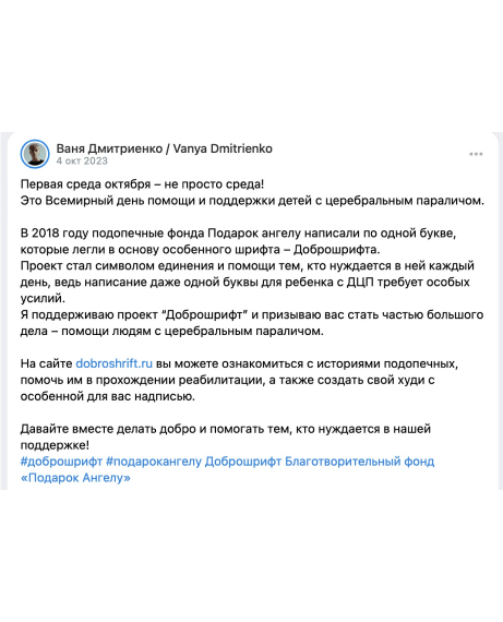 Теперь сотни компаний и тысячи людей используют Доброшрифт каждую первую среду октября, чтобы привлечь внимание к проблемам маломобильных людей и оказать помощь тем, кто в ней нуждается.